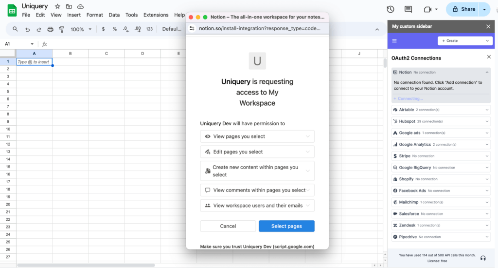 Integrating Notion with Google Sheets is a powerful way to automate and streamline your workflow, saving you time and effort. Uniquery, a versatile Google Sheets API connector, facilitates this integration by allowing you to create API queries with OAuth2 connections easily. This guide will walk you through the steps of connecting your Google Sheets to your Notion workspace via Uniquery.